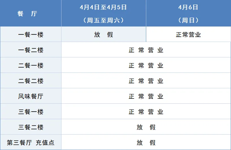 根据学校《关于2025年清明节放假安排的通知》,结合实际情况,各餐厅开放安排如下: